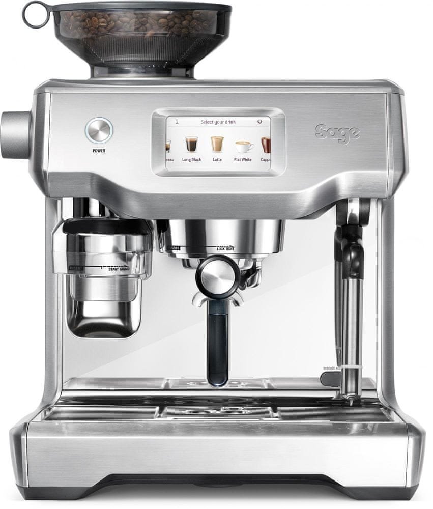 Profesionální automatické pákové espresso Sage BES920 s dotykovým displejem a v nerezovém provedení. Automatizovaná obsluha na dotykovém displeji zjednodušuje způsob, jak vytvořit vaši oblíbenou kávu ve třech jednoduchých krocích – mletí kávy, uvaření kávy a úprava mléka. Můžete snadno nastavit sílu kávy, texturu mléka nebo teplotu podle vaší chuti.